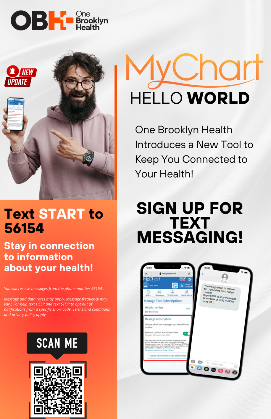 Introducing One Brooklyn Health's new MyChart Messaging Feature! Stay connected to your health with ease – receive appointment reminders, doctor’s notes, important updates, and more, all directly to your phone. It’s the simplest way to keep track of your care. Signing up is easy! Just text START to 56154 or scan the QR code below to get started. Stay informed, stay healthy!
